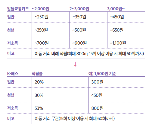 ◆ 기존 알뜰교통카드 제도의 불편 사항을 개선하여 다양한 혜택으로 이용자들의 편익을 강화함