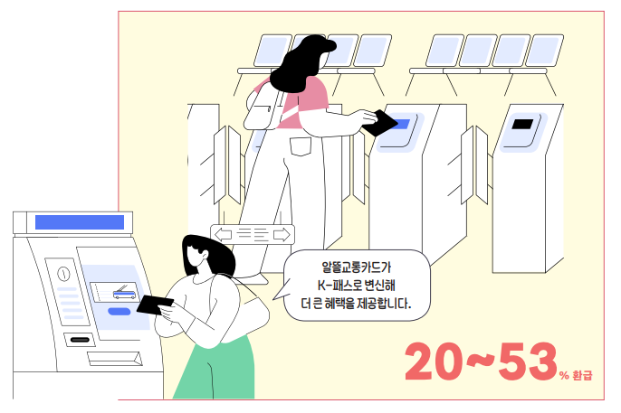 ◆ 월 15회 이상 정기적으로 지하철과 시내버스와 같은 대중교통을 이용할 경우 최대 60회까지 이동거리와 관계없이 지출된 금액의 비율에 따라(20~53%) 다음 달 현금과 마일리지, 카드공제 등 직접 환급받을 수 있는 교통카드.